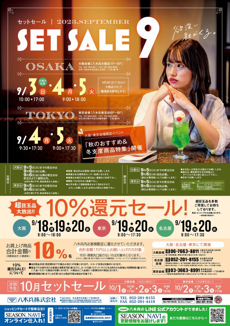 LINE公式アカウントでは、SEASON_NAVI(八木兵オンライン発注サイト)の更新情報や、 最新のイベント情報を配信しております。